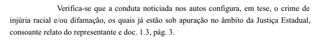“Verifica-se que a conduta noticiada nos autos configura, em tese, o crime de injúria racial e/ou difamação.”