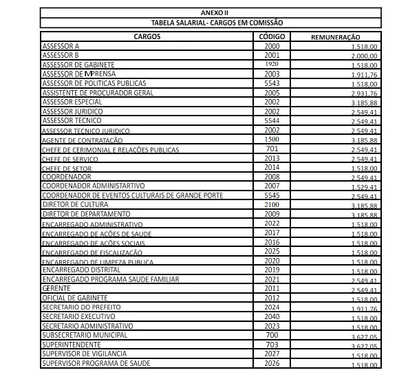 A lei fixa a remuneração dos cargos em comissão conforme a tabela do Anexo II, com salários que variam de R$ 1.518,00 (casos como Assessor A, Assessor de Gabinete e diversos encarregados) a R$ 3.627,05 (casos como Superintendente e Subsecretário Municipal).
