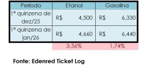 O preço médio dos combustíveis nos postos brasileiros registrou alta na primeira quinzena de janeiro de 2026, na comparação com a primeira quinzena de dezembro de 2025. O etanol apresentou aumento mais expressivo no período, de 3,56%, passando de R$ 4,50 para R$ 4,66. Já a gasolina teve alta de 1,74%, com o preço médio subindo de R$ 6,33 para R$ 6,44. Os dados são da mais recente análise do Índice de Preços Edenred Ticket Log (IPTL), levantamento que consolida o comportamento de preços das transações nos postos de combustível e traz uma média precisa do valor praticado nas bombas em todo o País.